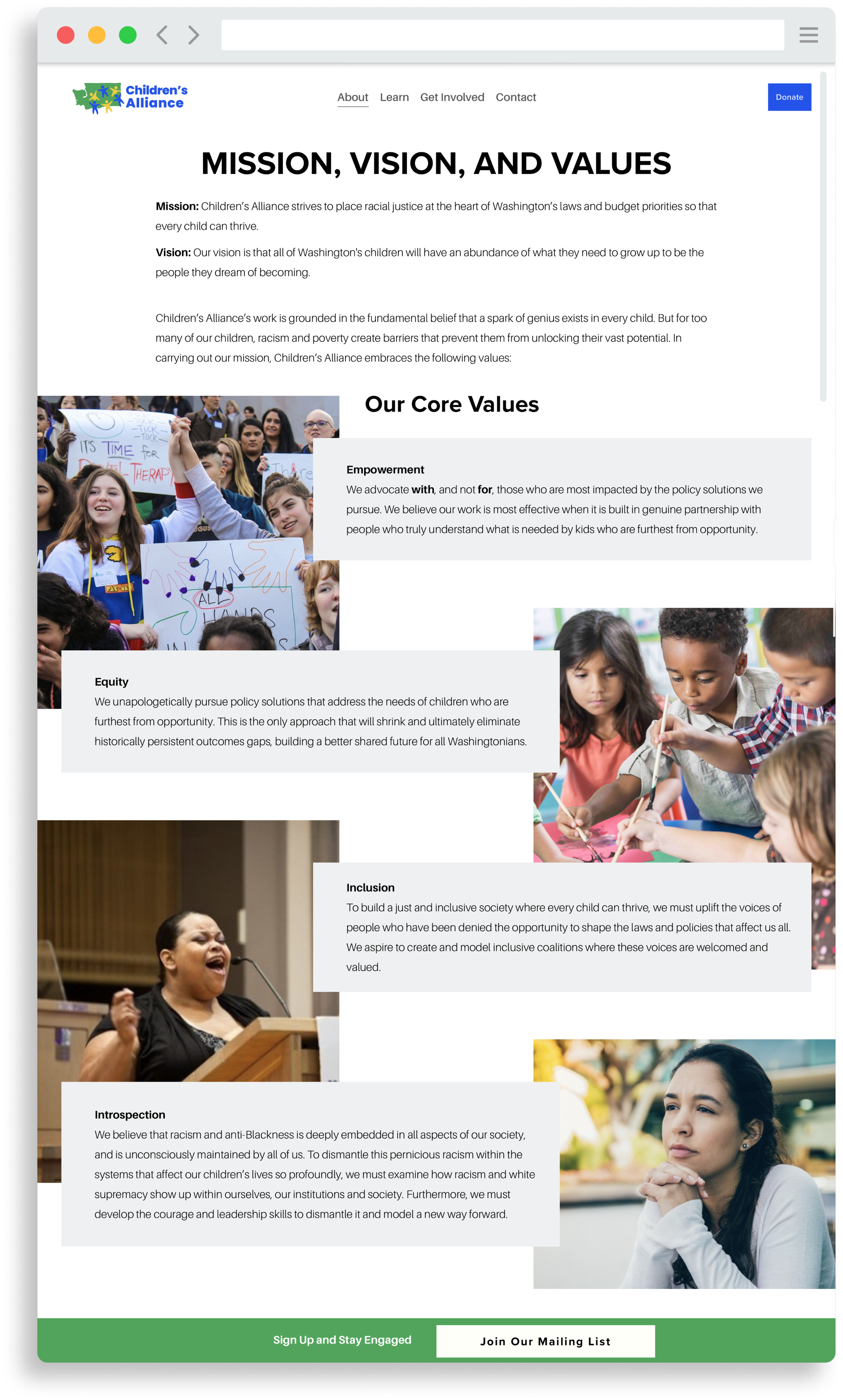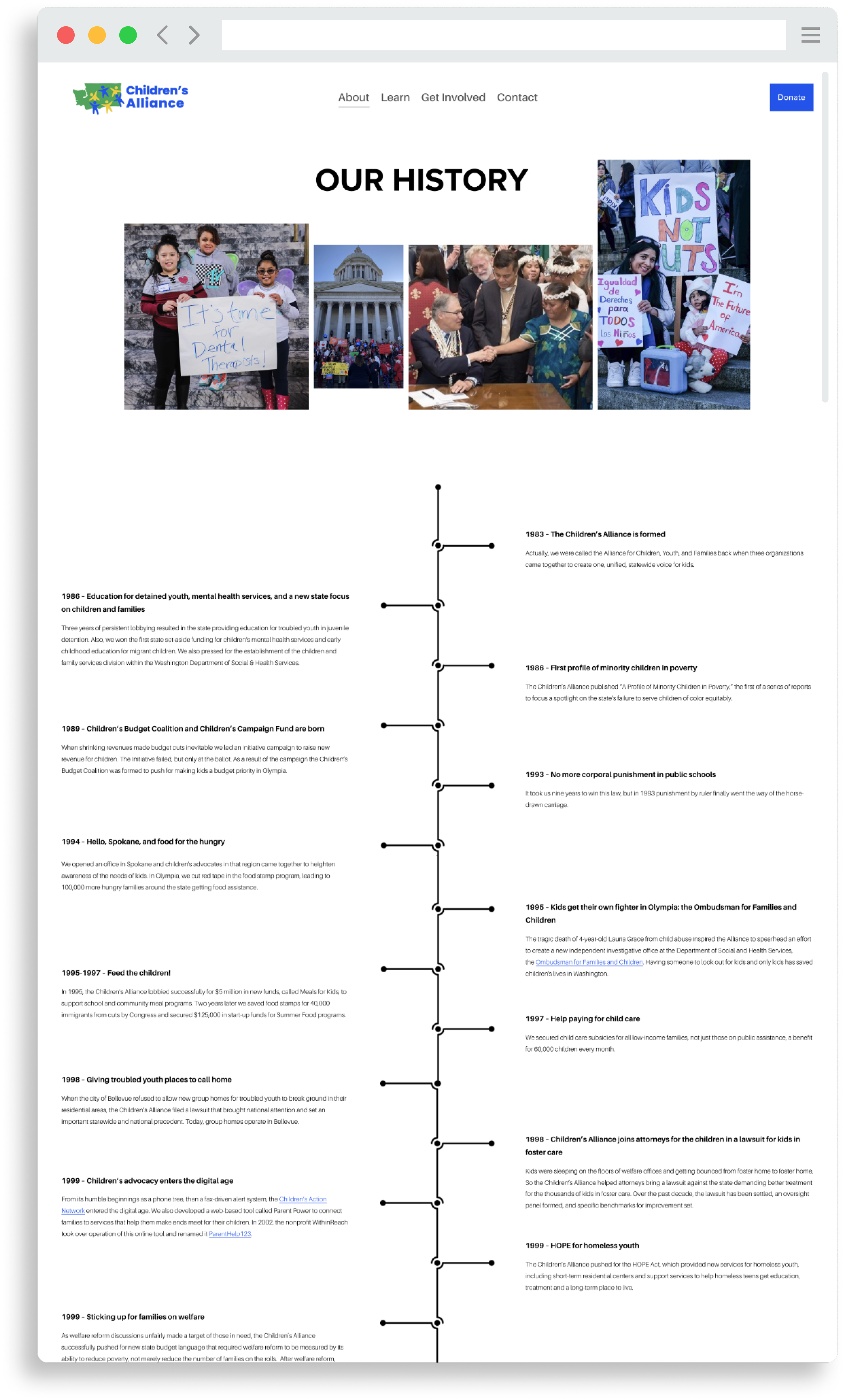 With an antiquated website, The Children's Alliance faced a critical challenge in maximizing their online presence and ultimately displaying their value proposition to potential donors. As a result, efforts to attract donors, advocates, and policymakers were impeded by the existing website.