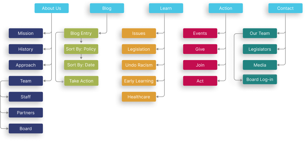 Similar sections were grouped and consolidated in the proposed sitemap, and iteratively validated by a selection of Children’s Alliance users to accommodate desires for simpler website navigation.